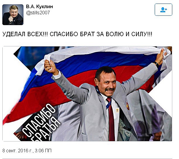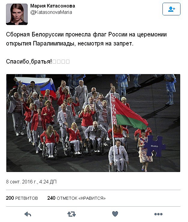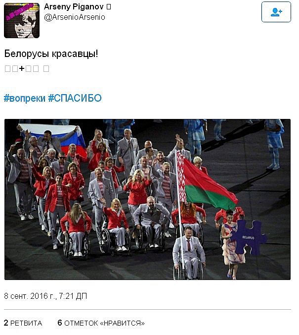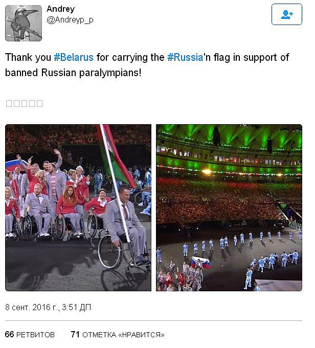 Издание отмечает, что спортсмену удалось пройти около четверти круга, прежде чем флаг был конфискован. В Минспорта Беларуси заявили, что акция солидарности с российскими паралимпийцами — это частная инициатива. Однако президент Белоруссии Александр Лукашенко поддержал вынос российского флага на церемонии открытия Паралипиады в Рио. Об этом заявила пресс-секретарь президента Наталья Эйсмонт. По ее словам, это была государственная позиция, в том числе позиция главы страны и председателя Национального паралимпийского комитета Олега Шепеля.