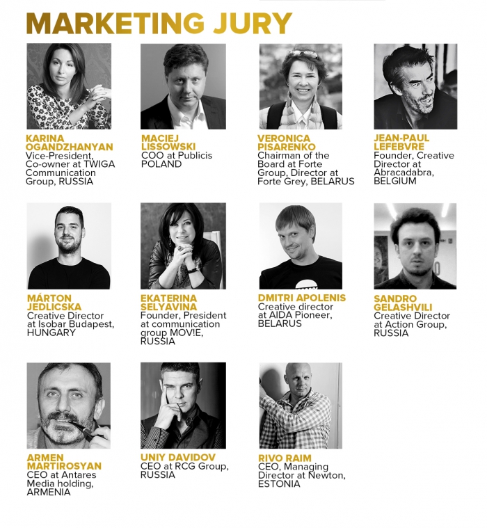На данный момент назван полный состав жюри маркетинга. Жюри будет оценивать работы, участвующие в конкурсах: рекламных кампаний; медиа-проектов; маркетинговой эффективности; BTL, PR и DM-проектов.