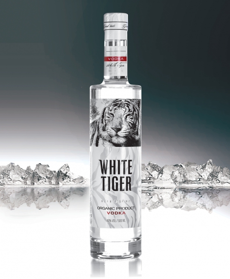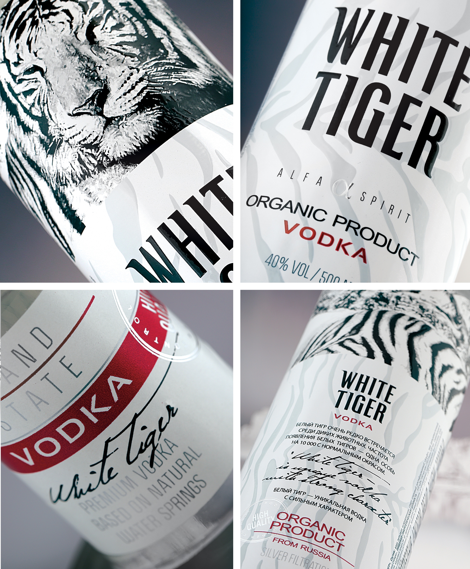 На этикетке водки креаторы использовали натуралистичную иллюстрацию белого тигра в естественной среде обитания.