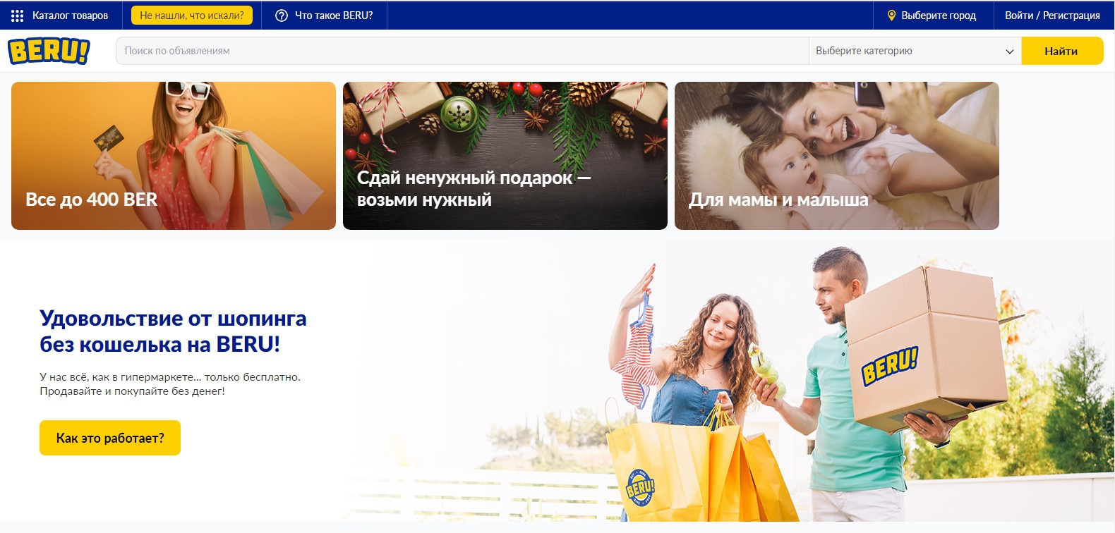 Параллельно, под цели масштабирования проекта, мы провели ребрендинг — сервис стал называться «BERU!». Это название я придумала не случайно: среди пользователей нашего сервиса слово «беру» — самое популярное. А мне как маркетологу, конечно, хотелось, чтобы нейминг отражал всю суть проекта — что вещи можно не покупать, а брать, не отдавая взамен деньги (для визуализации этого процесса стандартную кнопку «Купить!» на нашем сайте мы заменили на «Беру!»).