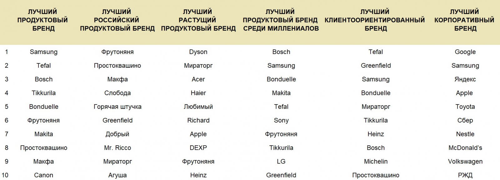 - «Лучший продуктовый бренд» — Samsung, Tefal, Bosch, Tikkurila, Bonduelle, «Фрутоняня», Makita, «Простоквашино», «Макфа», Canon.