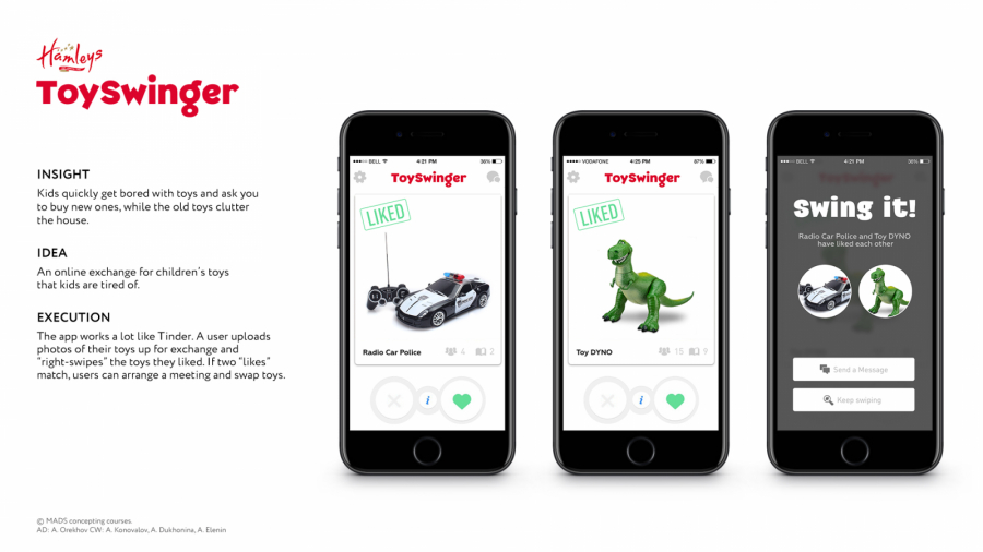 Так, на курсе концептинга mads была придумана идея ToySwinger — приложения для обмена надоевшими игрушками. Оно даёт им вторую жизнь и помогает решить проблему пластиковых отходов. Идея получила первое место на курсе, и команда продолжила работу.