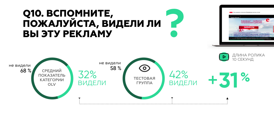 - Показатель спонтанного знания препарата «Бифиформ» у видевших рекламу оказался на 44% выше, чем у тех, кто рекламу не видел (18,0% vs 12,5%).