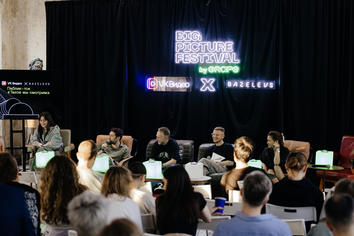 17 июля в рамках фестиваля коммерческого видеопродакшена Big Picture by Grape прошел первый паблик-ток — дискуссионная сессия «Такое мы смотрим», организованная совместно с «VK Видео» и продакшном Bazelevs. Участники встречи — представители индустрии видеопроизводства, режиссеры, креативные продюсеры и маркетологи — смотрели и обсуждали видеоконтент: от рекламных роликов и шоу до коротких форматов. Об этом Sostav рассказала команда