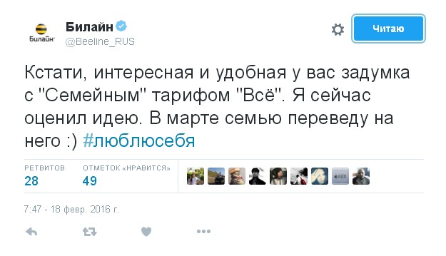 Вечером 18 февраля в официальном твиттер-аккаунте "Билайна" появился пост, авторы которого от имени самой компании похвалили "Билайн" за новый "семейный тариф "Все". Несмотря на то, что твит быстро удалили, интернет-пользователи успели распространить скриншот по соцсетям.