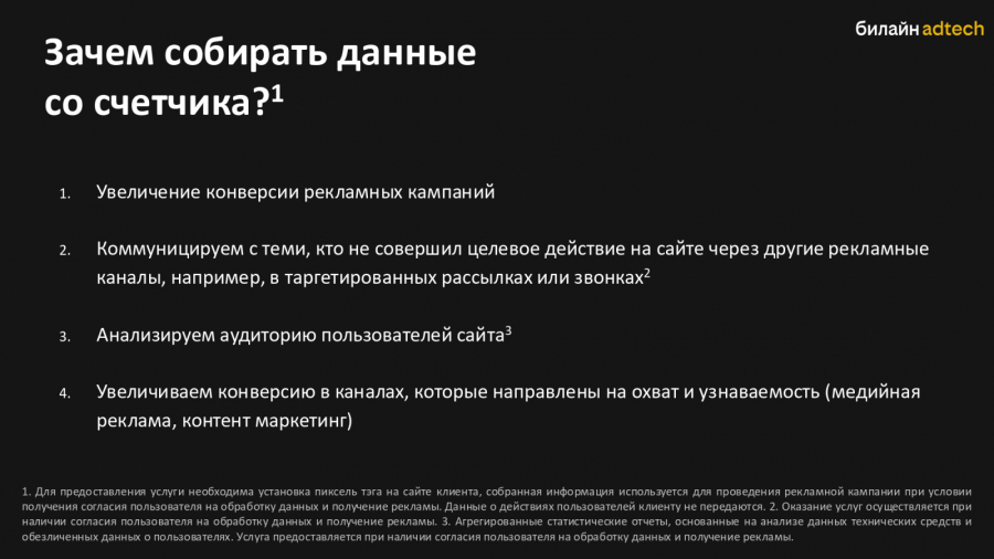 В частности, счетчик подбирает сегмент аудитории, интересовавшийся определенной услугой на сайте. Таким пользователям можно отправить сообщение с промокодом на данную услугу и тем самым мотивировать их к покупке.