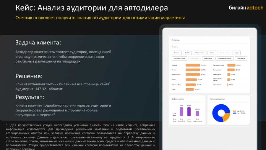 С помощью счетчика было собрано 150 тыс. целевых абонентов. Для формирования аналитики обезличенные данные об оказанных услугах связи пользователям, собранным пикселем, были проанализированы предиктивными математическими моделями. В результате удалось выяснить, что такие пользователи склонны иметь загородную недвижимость, они часто путешествуют на автомобиле и большинство среди них — футбольные фанаты.
