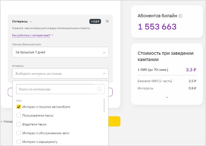 В «Билайн.Продвижении» при заведении SMS-кампаний, пуш-рассылок, настройке таргетированных звонков доступно порядка 70 интересов, разбитых для удобства на различные тематические группы. Можно также выбрать период проявления интереса.
