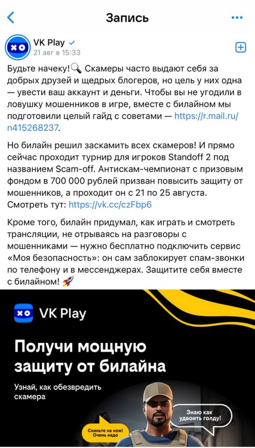 Сервис «Моя безопасность» от «билайна» уже защищает пользователей мобильного оператора от телефонных мошенников и спама. Теперь же «билайн» обучил киберсообщество Standoff 2 распознавать обман в компьютерных играх и не реагировать на уловки скамеров.