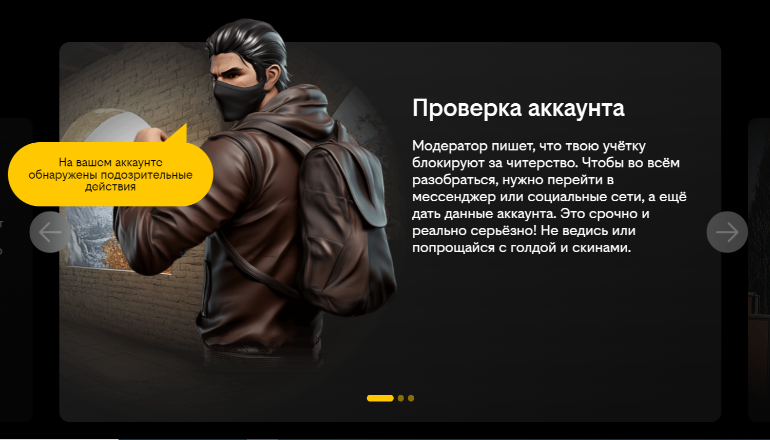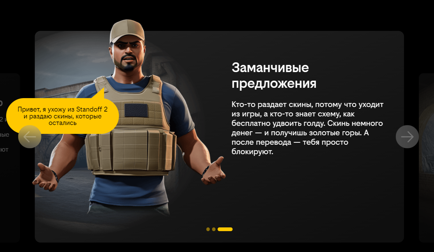 Здесь попавшиеся на обман люди могли узнать больше о мире скамеров. В первую очередь, человека предупреждали, что он поступил очень опрометчиво, перейдя по неизвестной ссылке. Дальше рассказывали, как понять, что тебе пишет именно мошенник, знакомили с распространенными мошенническими схемами и техникой безопасности против скамеров.