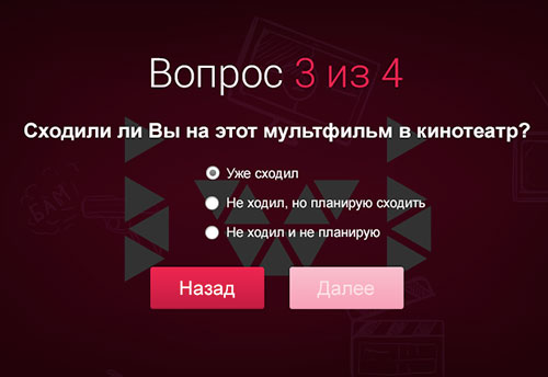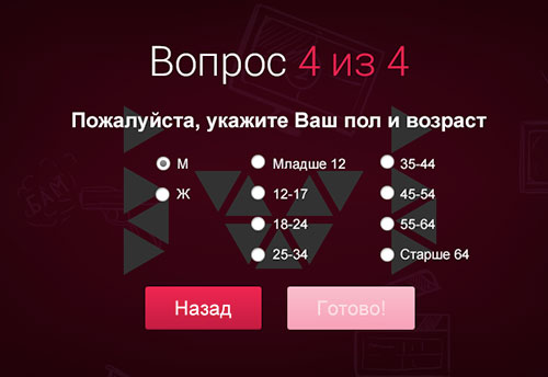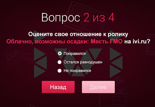 Пользователю, во время обычного рекламного блока показывался интерактивный ролик с вопросами анкеты, ответить на которые пользователь мог прямо в ролике, затратив 15-20 секунд своего времени. Каждому респонденту мог демонстрироваться только один из двух вариантов ролика - в зависимости от того, показывалась ли ему ранее тестируемая реклама или нет. В качестве примера приведен опросник для тестовой группы.