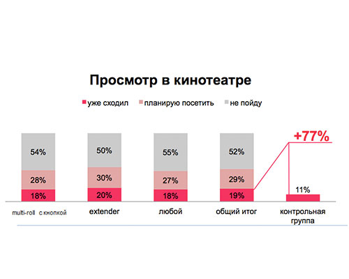 Как видно из полученного графика, основной вклад в прирост конверсии зрителей ivi.ru, контактировавших с рекламой в зрителей кинотеатров, сделала группа вспомнивших факт просмотра трейлера на VOD сервисе. В то время как показатель посещаемости кинотеатров среди не вспомнивших трейлер коррелирует со значением, полученным по контрольной группе.