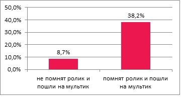 Самый интересный вывод показал анализ посещения кинотеатров внутри тестовой группы: среди тех, кто вспомнил, что контактировал с рекламой на ivi и тех, кто этого не вспомнил. Напомню: факт показа рекламы фиксировался и записывался в виде cookie файла в браузер пользователя, так, что в дальнейшем при отборе участников опроса, анкетирование предлагалось только идентифицированным пользователям.