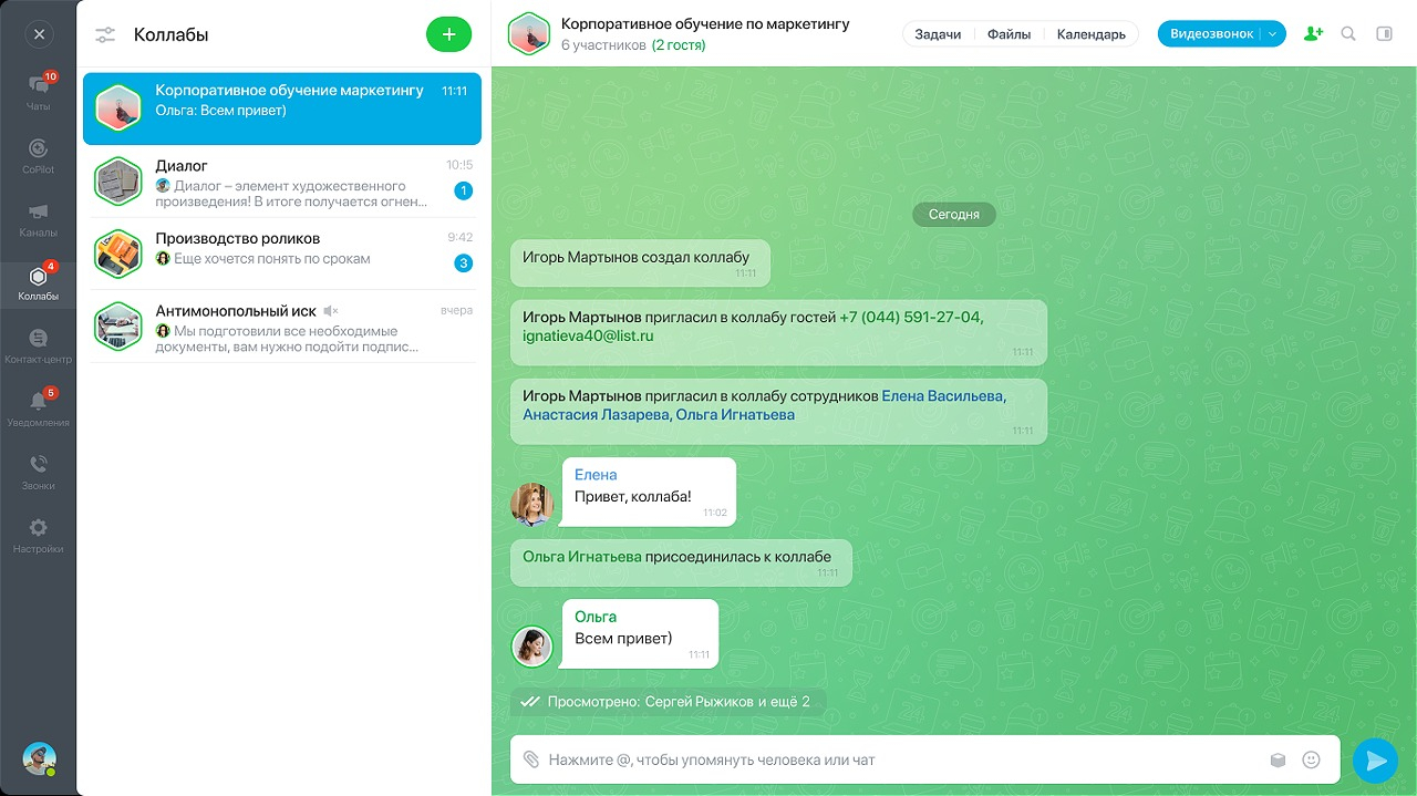 Кроме того, в «Коллабах» возможны видеозвонки, имеется доступ ко всем файлам проекта, задачи и общий календарь.