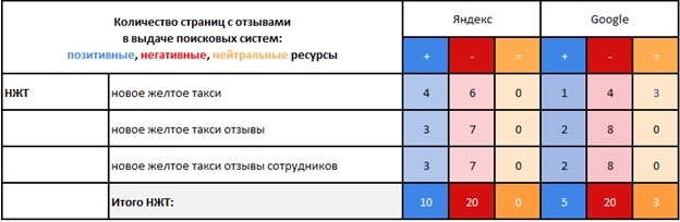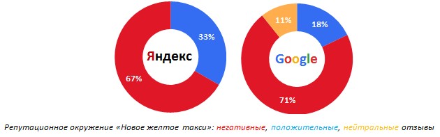 Общий репутационный фон бренда – негативный. По запросу: «Новое желтое такси отзывы» обнаружен сплошной негатив, работа с которым не ведется ни на одном из ресурсов первых страниц выдачи «Яндекс» и Google. Больше всего отрицательных откликов, на сайтах Spr.ru и Yell.ru. Однако на последнем большое количество положительных отзывов, что вызывает подозрения, учитывая общий негативный фон.