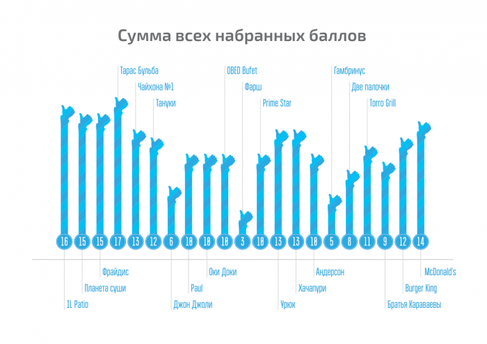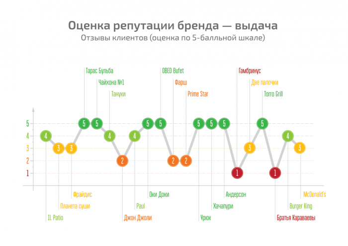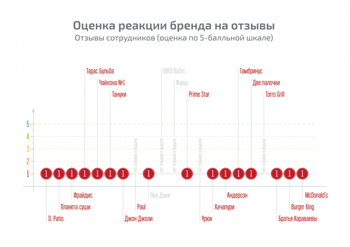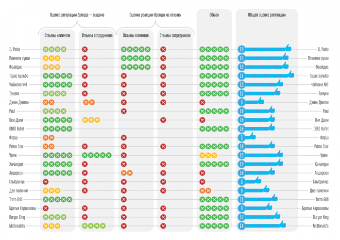Мы рассмотрели ресторанные сети совершенно разного уровня намеренно, так как оценивали не уровень сервиса и качество блюд, а отношение к ресторанам клиентов и сотрудников – пользователей интернета. Перед сайтами-отзовиками все равны и было интересно узнать, идут ли широко известные в России и новомодные заведения в ногу со временем и учатся ли они общаться с клиентами не только в залах ресторанов.
