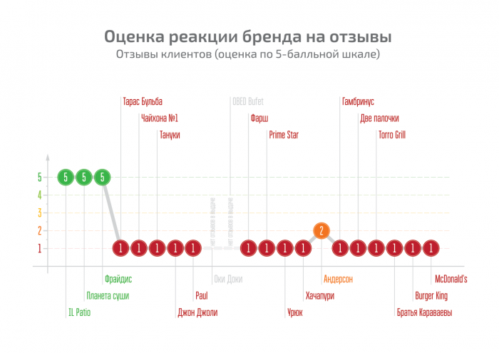 Ситуация хорошая, положительных отзывов намного больше, чем отрицательных, обман не идентифицирован. Негатива не много, но для идеальной картины не хватает реакции на него. Есть пример того, что действующим сотрудникам не комфортно от того, что не ведется централизованной работы с отзывами. На одной из площадок-отзовиков размещено сообщение: «Здравствуйте. Я директор ресторана, в котором произошел инцидент. Приношу свои извинения. (…) Если вас не затруднит, наберите мне по телефону». Далее в комментариях пользователи язвительно пишут о том, что прошло 4 месяца с момента написания негативного отклика и вряд ли кто-то перезвонит. Но директор ответил, что надеется на обратную связь и хочет принести извинения лично, отметив, что про сайт с отзывами и негативе в адрес своего ресторана случайно узнал от друзей.