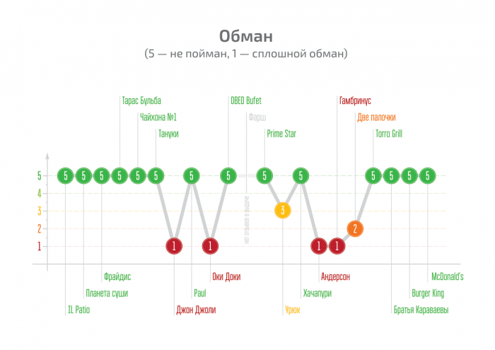 Не смотря на громкое имя, репутационный фон у ресторанов этой группы сильно проигрывает конкурентам. Ситуация с отзывами по всем заведениям Ginza Project примерно одинаковая: реакция бренда на негатив отсутствует, положительных отзывов больше, при этом в целом пользователи довольно мало пишут о ресторанах. Однако два бренда группы попались на обмане.