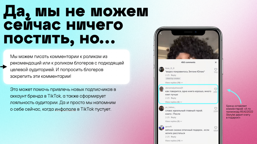 - Мы всё ещё можем сидеть в TikTok и смотреть ранее опубликованный контент. И кажется, что сейчас у нас есть отличный шанс использовать инструмент комментариев, поработать с аудиторией по части community-менеджмента.
