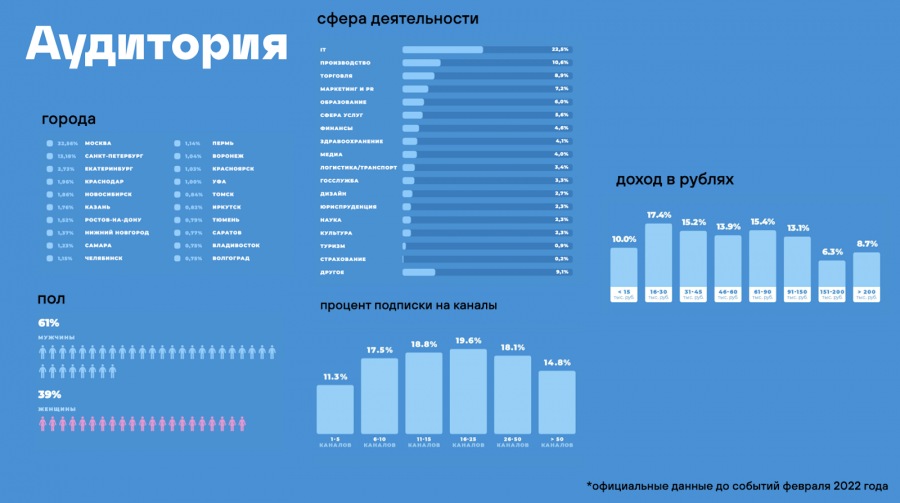 - Трафик инфлюенсеров, перетекающий в Telegram, составляет самая лояльная и активная аудитория. По сравнению с Instagram и VK, где средняя вовлеченность 5%, в Telegram данный показатель больше — около 15−30%. Конверсия в подписчика из других площадок сейчас — довольно показательная метрика по ценности связи аудитории с блогером. Для рынка это может означать возможное увеличение performance-конверсий у блогеров: теперь за их контентом наблюдают только самые лояльные и вовлечённые подписчики. При этом важно понимать, что ситуация, когда все подписались на всех, не может длиться вечно. За массовым притоком обязательно последует волна отписок.