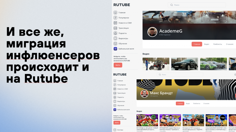 - Сейчас на Rutube не так много блогеров (основной массив контента — ТВ-шоу). И судя по количеству подписчиков у этих блогеров, просмотров там также не очень много.