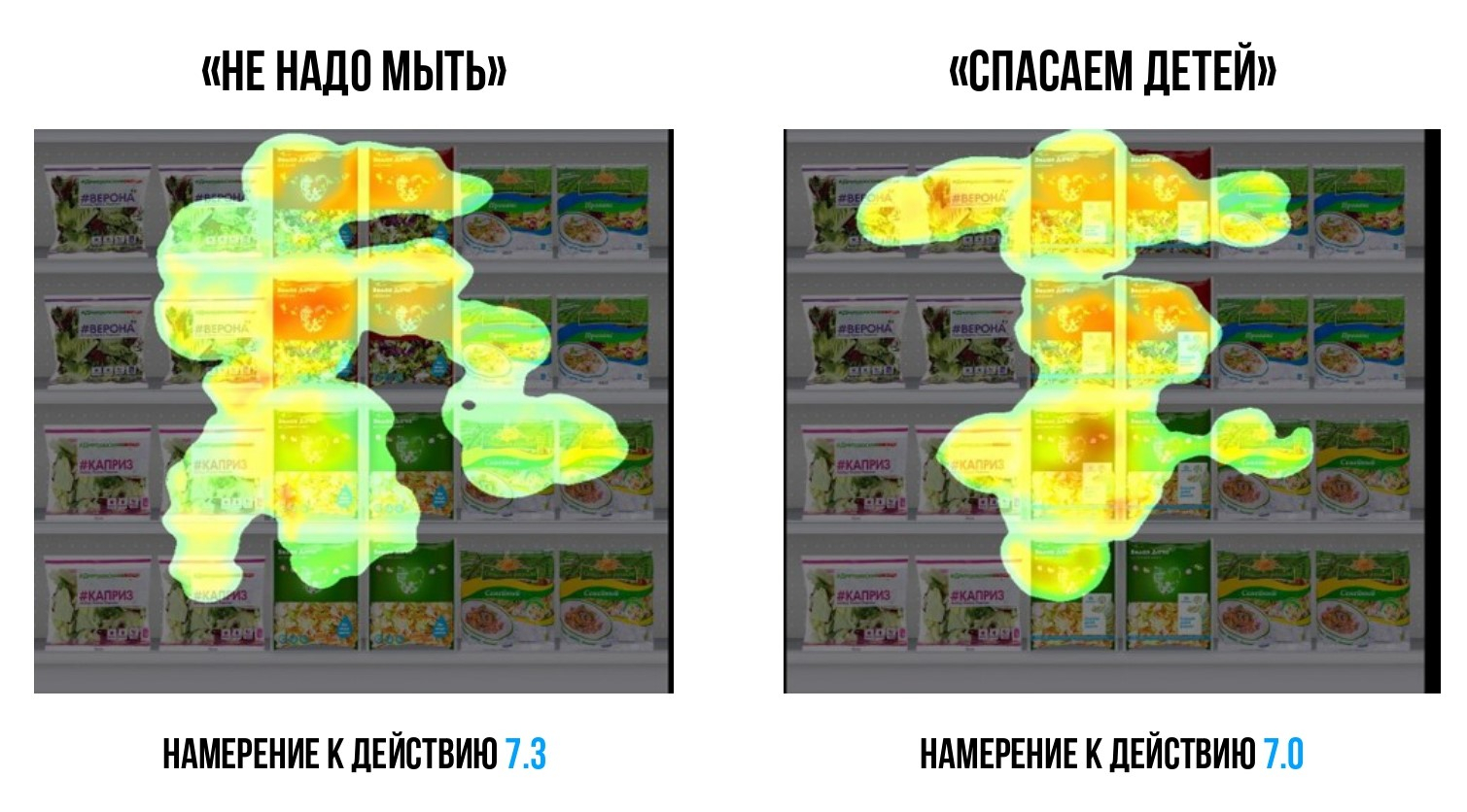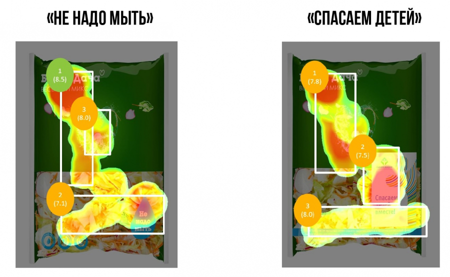 Выяснилось, что при сравнении оригинальной упаковки (с обозначениями «не надо мыть» и указанием полезных свойств салатов) и версии с эмблемой фонда «Линия жизни» на полке («Спасем детей вместе» и указанием условий акции), эмоциональный отклик во втором случае оказался статистически примерно таким же: 7.6 vs 7.9 по 10-балльной шкале при статистически значимой разнице равной 0.4. И это несмотря на то, что с упаковки были убраны заявления о ключевом конкурентном преимуществе товара — «не надо мыть».