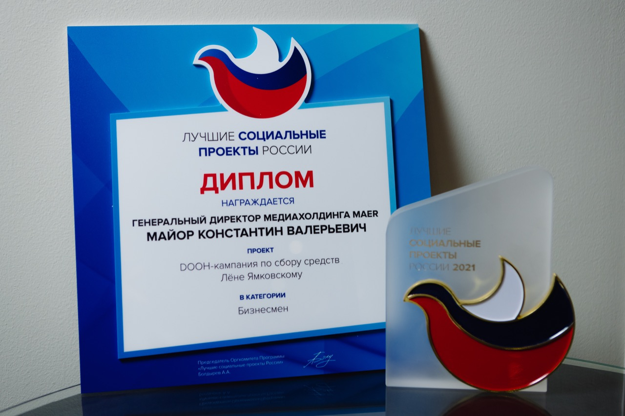 MAER второй год подряд становится победителем премии «Лучшие социальные проекты России». На прошедшей в Radisson Zavidovo церемонии награждения компания получила награду за охватную цифровую наружную кампанию по всей России о полуторагодовалом мальчике Леониде Ямковском, которому требовалась срочная помощь в борьбе с тяжелым заболеванием — спинальной мышечной атрофией.