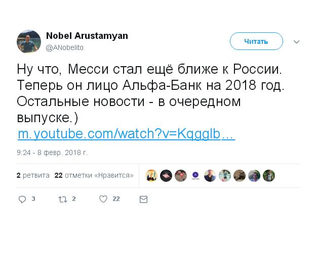 «Ну что, Месси стал еще ближе к России. Теперь он лицо Альфа-Банк на 2018 год», — написал Арустамян. Пользователи соцсетей уже публикуют фото, на которых звезда футбольного клуба «Барселона» раздаёт автографы в футболке с логотипом Альфа-банка.