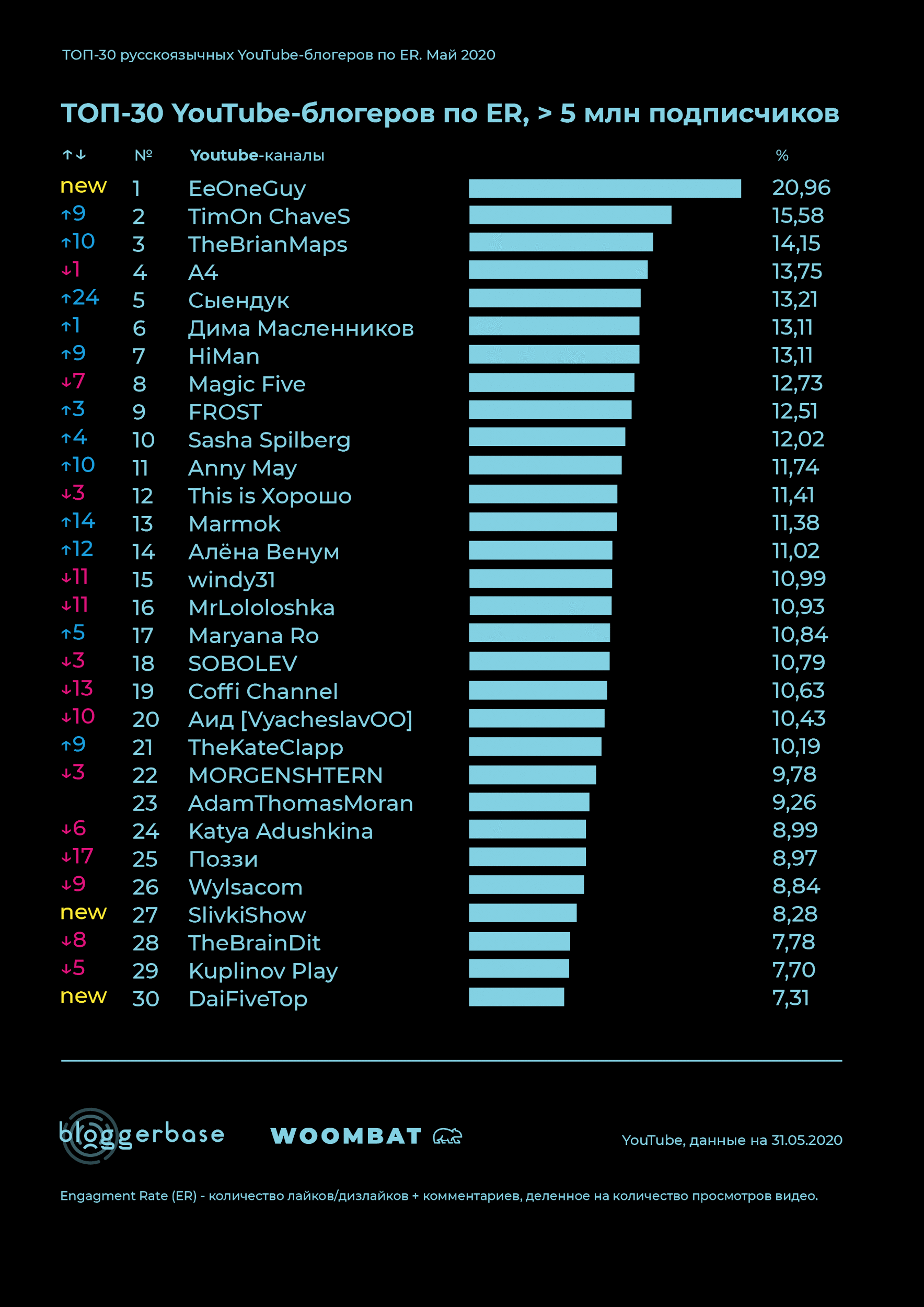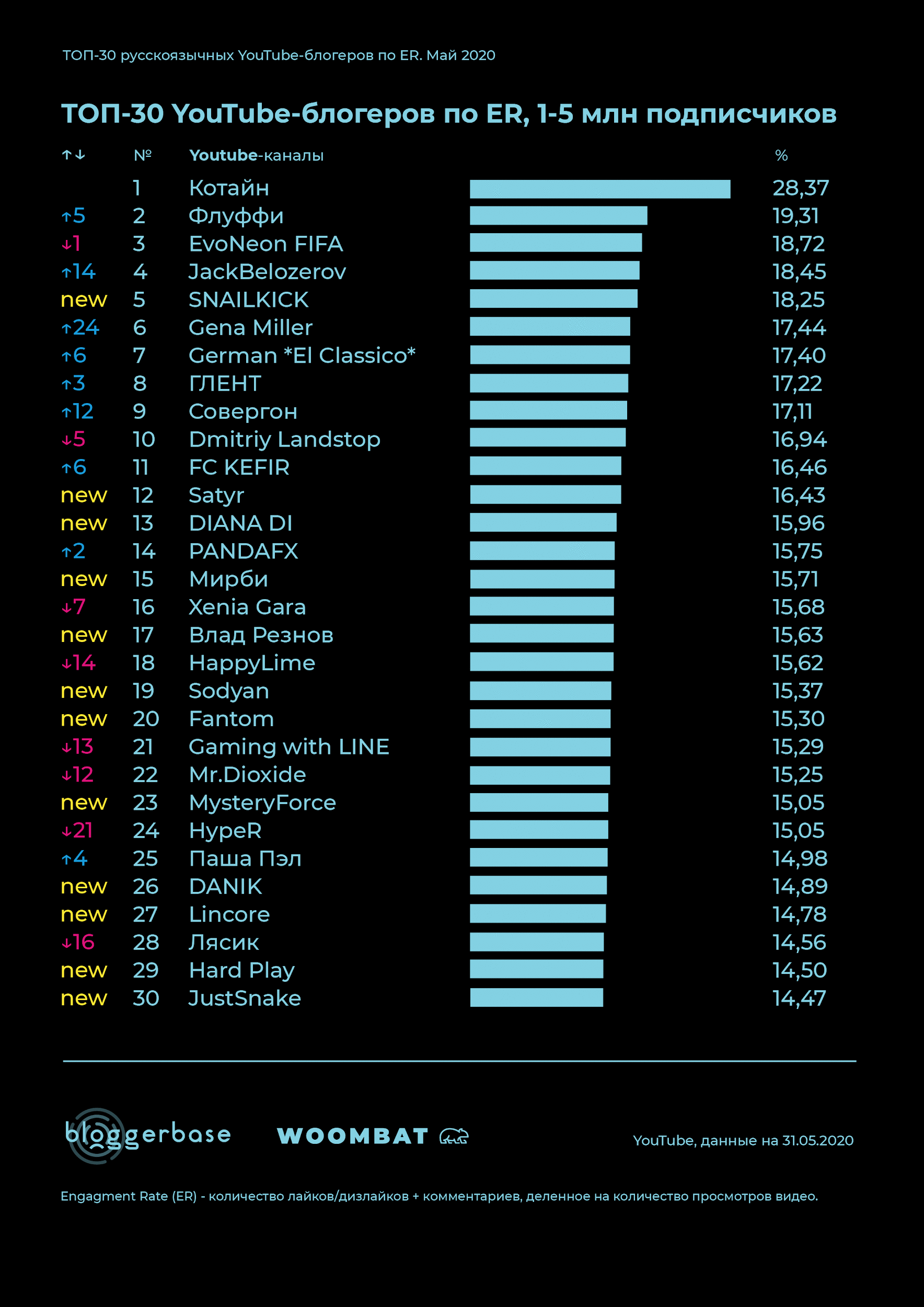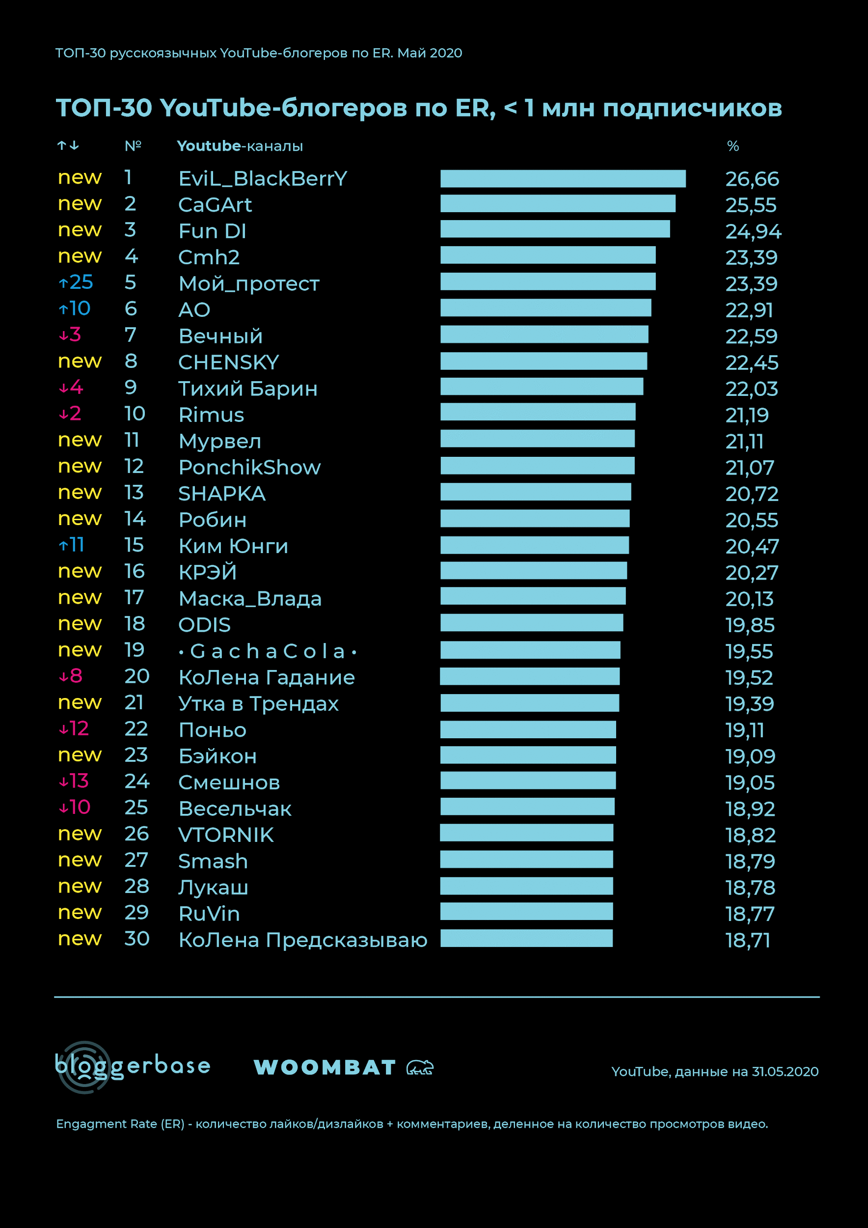 Woombat и аналитическая компания BloggerBase составили рейтинг топ-30 лидеров мнений видеохостинга в мае по показателю вовлеченности. Сравнивался топ с апрелем, в рейтинг так же вошли 90 блогеров в трех группах: более 5, от 1 до 5 и менее 1 млн подписчиков.