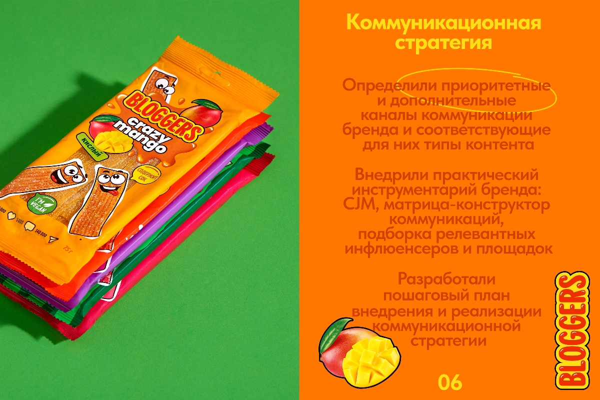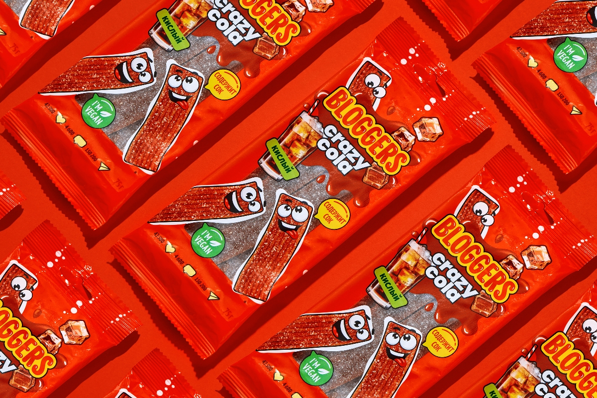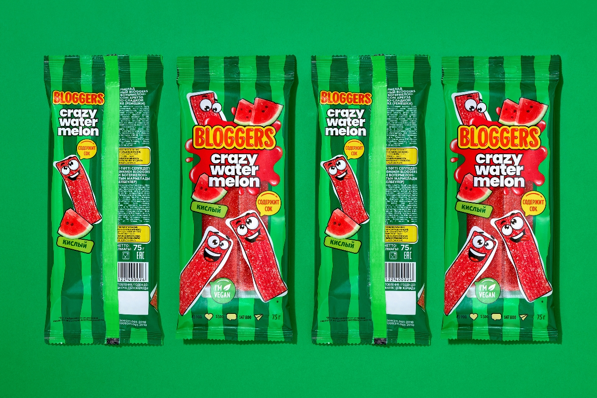 Вербальная айдентика уже сформировала mind map, от которой отталкивались дизайнеры, работавшие над оформлением упаковки. Атрибутами визуального образа мармелада Bloggers стал объемный, «сочный» шрифт логотипа и богатая, яркая палитра. А также озорные и веселые персонажи-мармеладки, формирующие эмоциональную связь с потребителями.