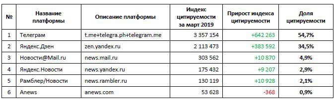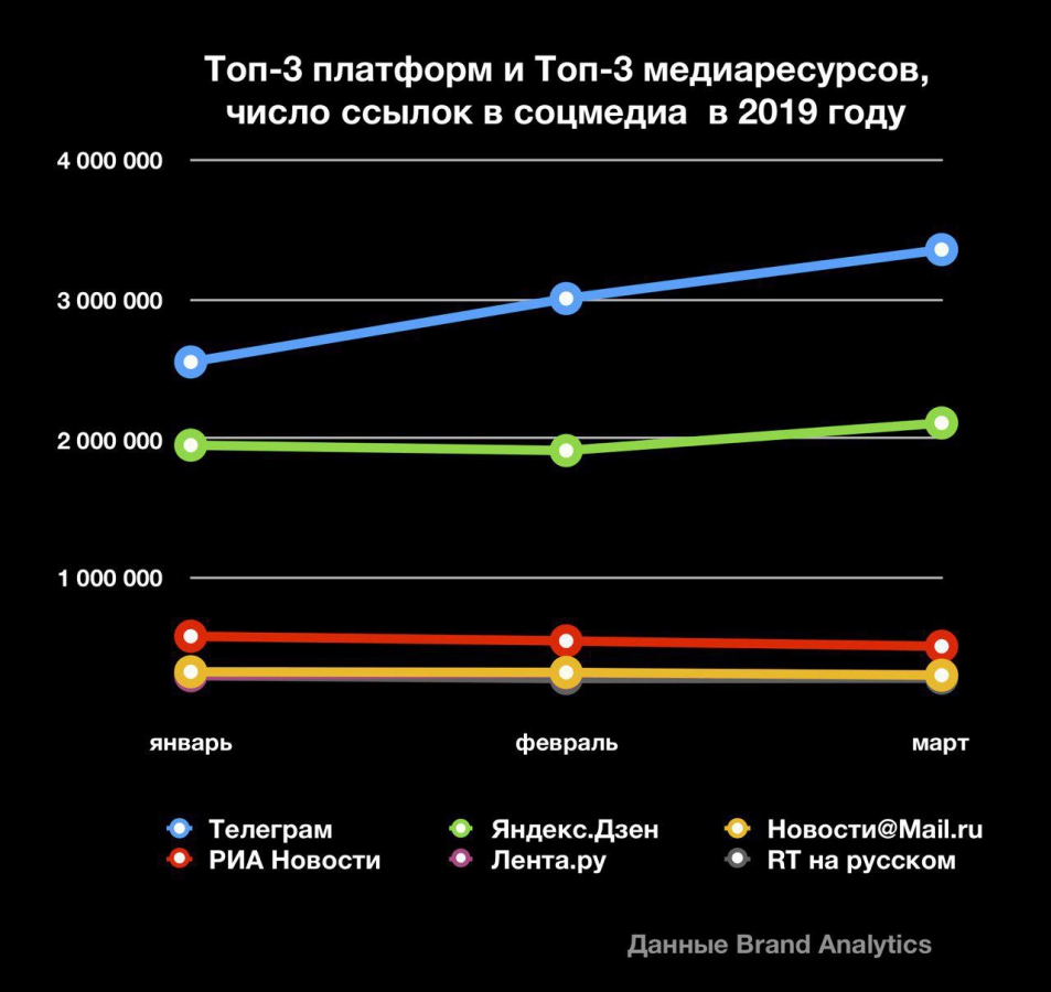 Согласно данным Brand Analytics, годовщину блокировки мессенджер встречает как самая влиятельная и быстрорастущая платформа распространения русскоязычного контента. В марте 2019 года индекс цитирования Telegram вырос на 32% по сравнению с январем. Пользователи социальных медиа оставили 3,3 млн ссылок на публичные каналы и чаты Telegram. Для сравнения — индекс самого цитируемого медиаресурса РИА Новости в 6 раз меньше (511 тысяч ссылок на материалы агентства).