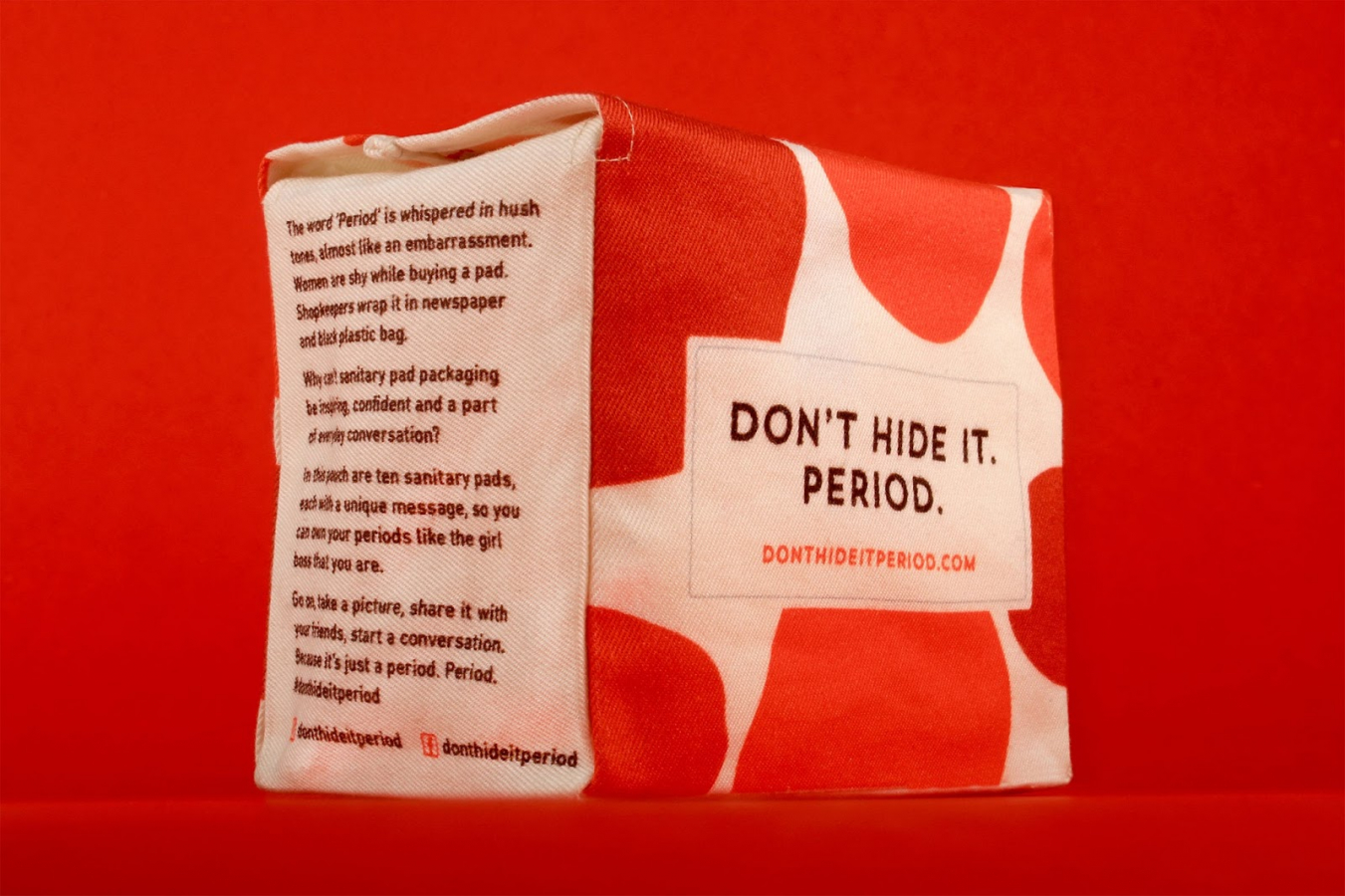 Тем временем в Индии, где табу на месячные являются обычным явлением, брендинговое агентство NH1 Design запустило кампанию Don’t Hide It Period («Не скрывай период»). Так же, как и в случае с TOTM, на товарах есть сообщения, расширяющие возможности: «Это просто кровь», «Не стесняйся» и «Основы биологии».