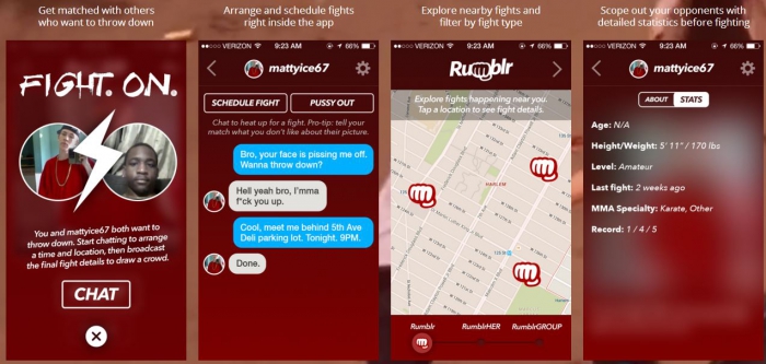 На сайте Rumblr говорилось, что приложение будет запущено 9 ноября. Разработчики преподносили его как бойцовский Tinder: пользователям предлагалось договориться о драке со случайным человеком, либо отклонить бой. Слоган обещал случайную драку без случайных жертв (бесплатно).