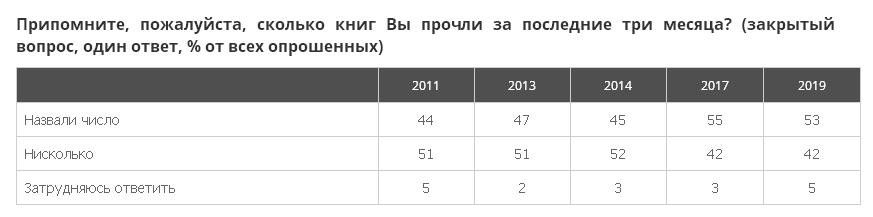 В среднем каждый из читающих прочел пять книг в течение трех последних месяцев. Больше всего книг прочитывают люди в возрасте старше 60 лет и респонденты, которые практически не пользуются интернетом.