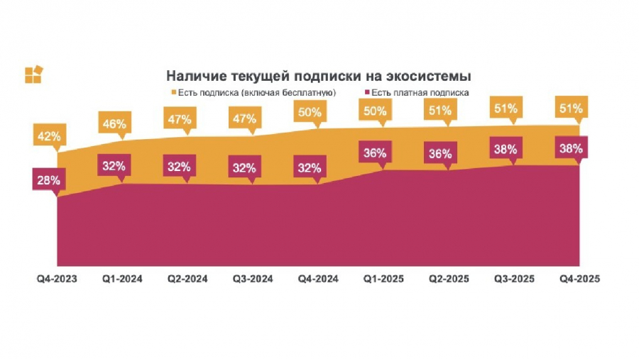 В четвертом квартале 2025 года 51% жителей российских городов пользовались экосистемными подписками, предоставляющими доступ к нескольким онлайн-сервисам одновременно. Уровень проникновения таких сервисов стабилизировался на отметке 50−51% после непрерывного роста в 2023−2024 годах. Рейтинг подготовила исследовательская компания ICMR (ООО «ГФК-Русь). Отчет есть в распоряжении Sostav.