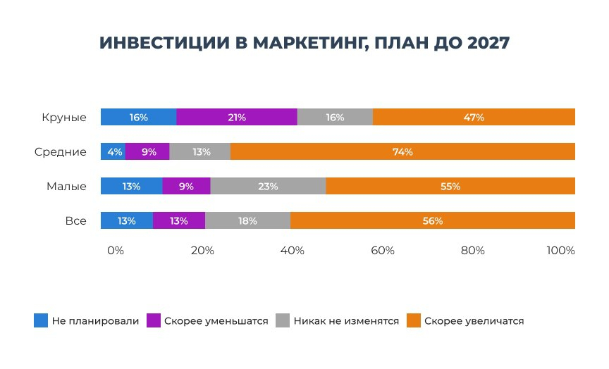 При этом в долгосрочной перспективе до 2027 года большинство (56%) компаний намерены наращивать инвестиции в маркетинг. Чаще всего о таких планах сообщали представители среднего бизнеса (74%). О вероятном снижении затрат на маркетинг чаще других заявляют в крупном бизнесе (21%).