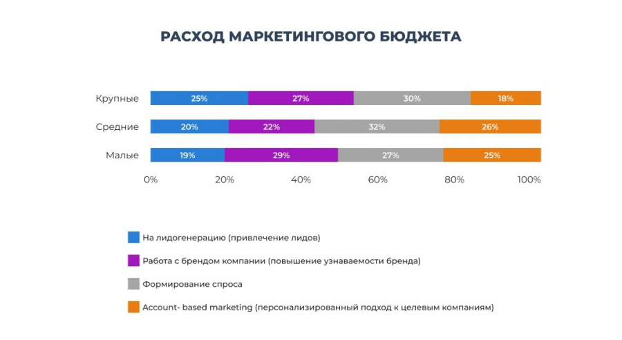 Наиболее значимыми инвестициями в маркетинг отличается малый бизнес (с выручкой до 800 млн руб. в год) — 15% от оборота компании. В среднем бизнесе (от 800 млн до 2 млрд руб. в год) — 12%, в крупном (более 2 млрд руб. в год) — 6%. Категории трат маркетингового бюджета также отличаются в зависимости от размеров бизнеса. Так, самая большая статья расходов на маркетинг в малых компаниях — повышение узнаваемости бренда (29%), а в средних и крупных — формирование спроса (32% и 30% соответственно). Меньше всего крупный бизнес тратит на персонализированный подход к целевым компаниям (18% маркетингового бюджета), а средний и малый — на лидогенерацию (20% и 19% соответственно).