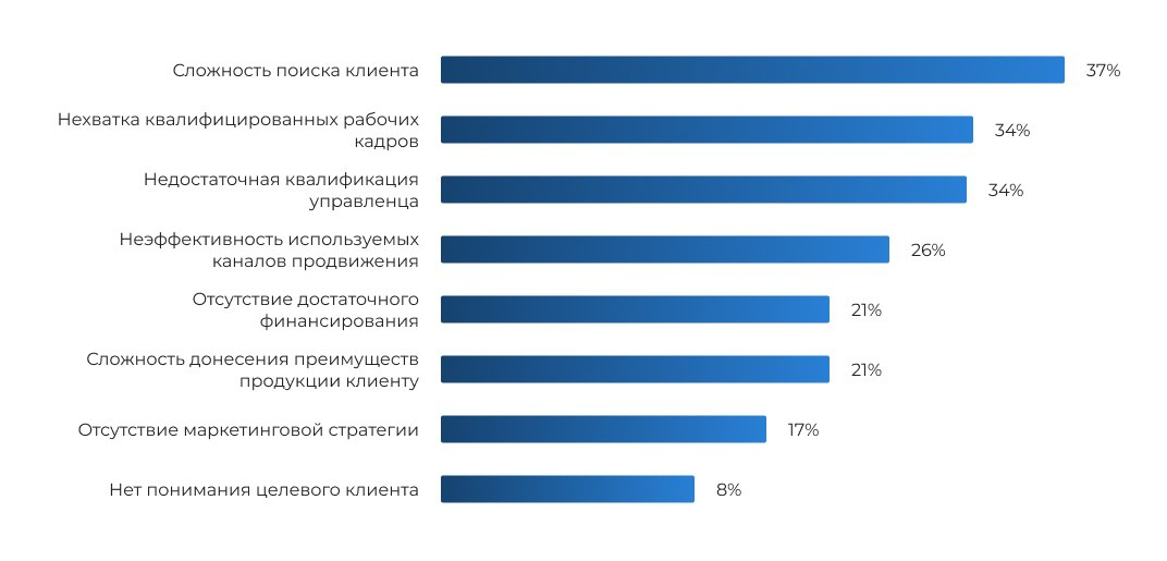Между тем именно инструменты маркетинга способны подстегнуть рост бизнеса и его финансовых показателей независимо от размеров предприятия. Это следует из ключевых сложностей, замедляющих развитие компаний. Так, 37% респондентов отметили, что главная преграда — сложность поиска клиентов. Этот фактор опередил даже общую боль российской экономики — кадровый голод, его назвали только 34%. Кроме того, 26% посетовали на неэффективность используемых каналов продвижения, 21% — на сложность донесения преимуществ продукции клиенту, 17% — на отсутствие маркетинговой стратегии. Наконец, 8% опрошенных в числе главных преград для развития бизнеса обозначили непонимание целевого клиента.