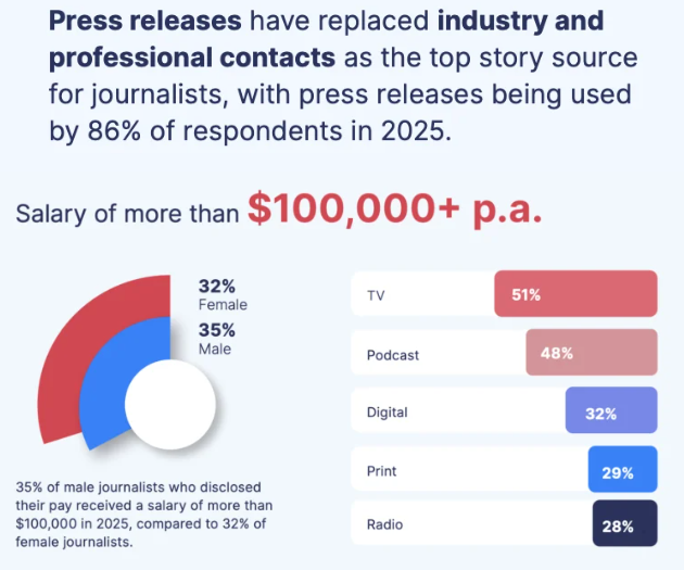 Пресс-релизы остаются ключевым источником информации — ими пользуются 86% журналистов, что говорит о возрастающем влиянии официальных коммуникаций на медиаповестку.