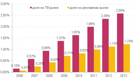 Доля доходов кабельно-спутниковых каналов в рекламных доходах ТВ и в доходах рекламного рынка в целом, 2009-2013 гг., %. Источник: АЦ Vi