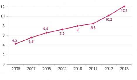 Динамика доли аудитории измеряемого тематического ТВ в общей телевизионной аудитории в 2006-2013 гг., %. Источник: TNS, АЦ Vi