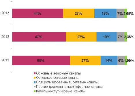 Распределение телерекламных бюджетов по группам телеканалов в 2011-2013 гг., %. Источник: АЦ Vi