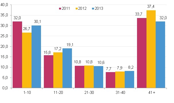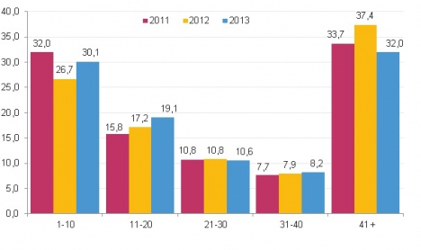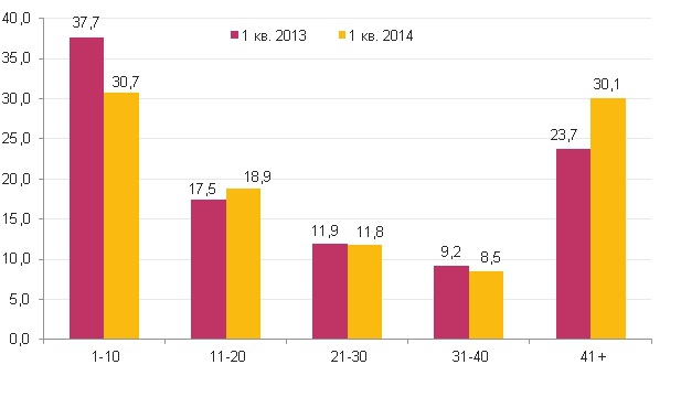 По итогам первого квартала 2014 года в сравнении с аналогичным периодом прошлого года можно отметить значительное снижение суммарной доли первой десятки рекламодателей и увеличение доли группы «41+». Относительно же всего 2013 года в первом квартале текущего года значительных изменений не произошло.