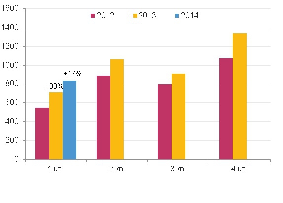 Объемы медиарекламных бюджетов в сегменте тематического ТВ в России в 1 кв. 2012-2014 гг., млн. руб. без НДС. Источник: АКАР