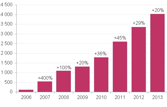 Объем и динамика медиарекламных бюджетов в сегменте тематического ТВ в России в 2006 – 2013 гг., млн. руб. без НДС. Источник: АКАР