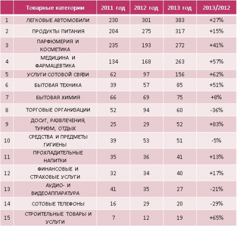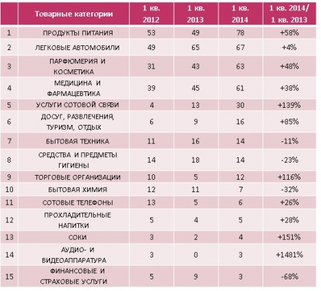 По итогам 1 квартала 2014 года большинство из ТОП-15 категорий товаров и услуг увеличили свои рекламные бюджеты по сравнению с прошлым годом. Исключение составили «Бытовая техника», «Средства и предметы гигиены», «Бытовая химия», «Финансовые и страховые услуги». Значительно увеличили свои рекламные расходы некоторые рекламодатели продуктов питания в результате чего впервые за долгое время «Легковые автомобили» опустились на вторую строчку.