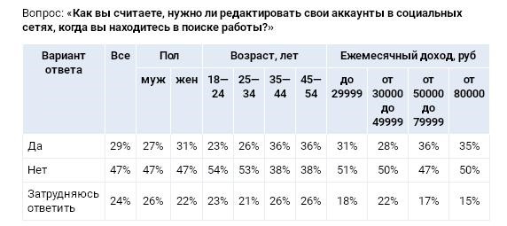 62% из них знает о том, что потенциальные работодатели могут заходить и просматривать их страницы. 29% убеждены в том, что статус соискателя обязывает править личные записи на страницах соцсетей. 13% редактировали свои аккаунты в соцсетях, когда искали работу. При этом старшее поколение чаще соглашается с необходимостью редактировать свои записи в соцсетях в период поиска работы.