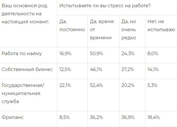 Интересно, что большинство из тех, кто испытывает стресс на работе, трудятся на госслужбе — это 22%, и только 5,3% из них не сталкиваются с нервной атмосферой на работе. Наименее подвержены стрессу фрилансеры, только 8,5% смогли уверенно сказать, что когда-либо испытывали стресс, а 18,4% не знают, что это такое.