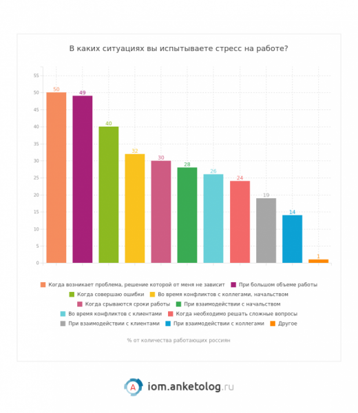 Наиболее часто люди испытывают стресс, если они не могут решить какую-либо задачу — больше половины респондентов — загружены слишком большим объемом работы (на это указали 49% людей) или же допускают ошибки (это уже 40%). Почти треть работников испытают дискомфорт из-за ссор с коллегами и начальством.