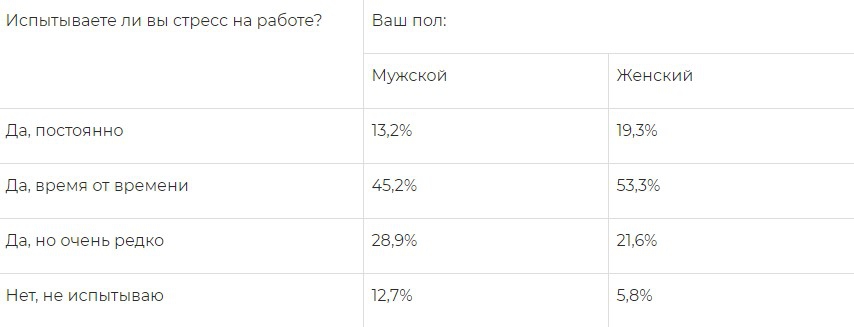 Интересно, что женщины наиболее подвержены постоянным стрессам на работе — в этом признались 19,3% девушек, чем мужины — 13,2% опрошенных.